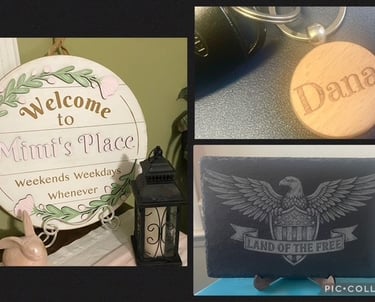Our personalized gifts showcase intricate designs and heartfelt messages, perfect for any occasion. From door signs to personalized key chains and more! Each piece is crafted with precision to ensure lasting memories for you and your loved ones.